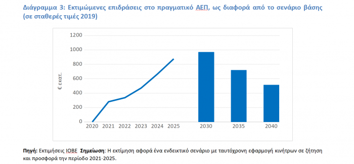 Στο σενάριο 5ετούς εφαρμογής μιας ενδεικτικής δέσμης κινήτρων μέτριας έντασης ταυτόχρονα σε ζήτηση και προσφορά, το άμεσο όφελος από τις καθαρές νέες επενδύσεις στην οικονομία εκτιμάται έως και υπερτριπλάσιο του άμεσου δημοσιονομικού κόστους. Το ετήσιο πραγματικό ΑΕΠ μπορεί να τονωθεί έως και 0,5 π.μ. και να παραμείνει υψηλότερο μεταξύ €0,3 και €1,0 δισεκ. κάθε χρόνο έως το 2040 (Διάγραμμα 3). Αντίστοιχα, η ετήσια απασχόληση εκτιμάται υψηλότερη μεσοσταθμικά την πρώτη 10-ετία κατά τουλάχιστον 5 και έως 8 χιλιάδες θέσεις απασχόλησης υψηλής παραγωγικότητας.