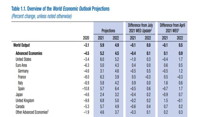 Το Ταμείο προχωρά σε μικρή υποβάθμιση της εκτίμησής του για την παγκόσμια ανάπτυξη, την οποία τοποθετεί στο 5,9% για το 2021, δηλαδή κατά 0,1% χαμηλότερη σε σύγκριση με την αντίστοιχη εκτίμηση τον Ιούλιο, ενώ για το 2022 παραμένει αμετάβλητη στο 4,9%.