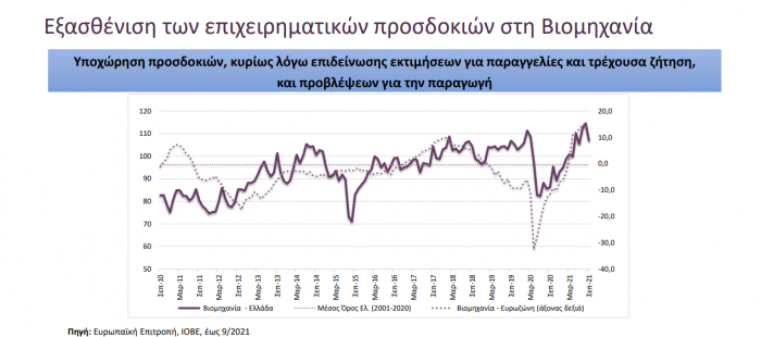 Επιπρόσθετα η αξιοποίηση του δυναμικού της βιομηχανίας σημείωσε ήπια εξασθένιση τον Σεπτέμβριο του 2021, μετά από υψηλό 12-ετίας ποσοστό του προηγούμενου μήνα. Οι μήνες εξασφαλισμένης παραγωγής υποχώρησαν στους 4,1 μήνες, με το ποσοστό χρησιμοποίησης εργοστασιακού δυναμικού να εξασθενεί στο 77,8% τον Σεπτέμβριο
