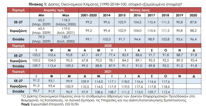 Η διεύρυνση της τουριστικής περιόδου και η μη επιβολή ισχυρών περιοριστικών μέτρων, παρά την έντονη έξαρση της πανδημίας, φαίνεται πως έδωσαν ώθηση στον τομέα των υπηρεσιών. Ο τομέας της βιομηχανίας συνέχισε να ευνοείται από τη σημαντική ανάκαμψη της παγκόσμιας οικονομίας και του διεθνούς εμπορίου. Στη βελτίωση του οικονομικού κλίματος συνέβαλε και η βελτίωση της καταναλωτικής εμπιστοσύνης, ύστερα από ένα πεντάμηνο επιδείνωσης. Η πρόσφατη αρνητική τάση εξισορροπείται σε ένα μέρος της, καθώς τα νοικοκυριά κινούνται σε ένα περιβάλλον συνεχιζόμενης αβεβαιότητας αλλά χωρίς σημαντικούς νέους περιορισμούς.