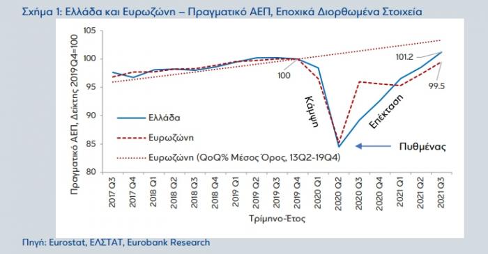 Σύμφωνα με τους αναλυτές της τράπεζας, η ελληνική οικονομία λόγω της υψηλής εξάρτησής της από τις υπηρεσίες και δη τον τουρισμό, υπέστη μεγάλο πλήγμα κατά τη διάρκεια του πρώτου χρόνου της υγειονομικής κρίσης. Η βαθιά συρρίκνωση της εγχώριας οικονομικής δραστηριότητας ήταν σε μεγάλο βαθμό τεχνική, καθότι η κυβέρνηση αναγκάστηκε να λάβει μέτρα κοινωνικής αποστασιοποίησης και αναστολής λειτουργίας πολλών επιχειρήσεων για τον περιορισμό εξάπλωσης της νόσου.