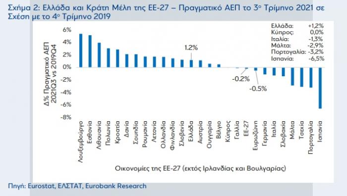 Τη βαθιά τεχνική ύφεση τη διαδέχτηκε ανάκαμψη τύπου «V», ήτοι δυναμική, απότομη. Βάσει των τριμηνιαίων εθνικών λογαριασμών (πηγή: ΕΛΣΤΑΤ), ο πυθμένας του τρέχοντος οικονομικού κύκλου ήταν το 2ο τρίμηνο 2020 (βλέπε Σχήμα 1), δηλαδή η περίοδος του πρώτου lockdown, με το πραγματικό ΑΕΠ να μειώνεται κατά 15,5% σε σύγκριση με το 4ο τρίμηνο 2019. Η φάση της επέκτασης ξεκίνησε το 3ο τρίμηνο 2020, η οικονομία παρουσίασε αξιοσημείωτη ανθεκτικότητα στον δεύτερο γύρο των περιοριστικών μέτρων και το 3ο τρίμηνο 2021, επιτυγχάνοντας ρυθμό μεγέθυνσης της τάξης του 2,7% QoQ / 13,4% YoY, το πραγματικό ΑΕΠ στην Ελλάδα διαμορφώθηκε στα €46,5 δισ., μεγαλύτερο κατά 1,2% σε σύγκριση με τα προ πανδημίας επίπεδα. Η εν λόγω επίδοση είναι υψηλότερη σε σχέση με τον μέσο όρο της ΕΕ-27 (-0,2%) και της Ευρωζώνης (-0,5%) και κατατάσσει την ελληνική οικονομία στην πρώτη θέση ανάμεσα στις χώρες του Νότου σε όρους ανάκαμψης από την πανδημία (βλέπε Σχήμα 2).