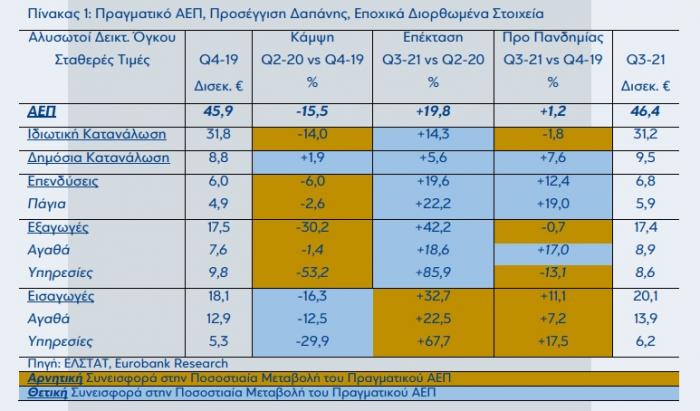 - Οι εξαγωγές, λόγω της αρχικής ανθεκτικότητας και μετέπειτα επέκτασης των εξαγωγών εμπορευμάτων, αλλά και της ανάκαμψης των εξαγωγών υπηρεσιών (τουρισμός και μεταφορές), προσέγγισαν τα επίπεδα του 4ου τριμήνου 2019. Εξαιτίας της φύσης της διαταραχής, η επίδοση δεν ήταν ομοιόμορφη στους δύο τομείς, με τις εξαγωγές αγαθών το 3ο τρίμηνο 2021 να υπερβαίνουν κατά 17,0% τα προ πανδημίας επίπεδα και τις εξαγωγές υπηρεσιών να υπολείπονται κατά 13,1%.