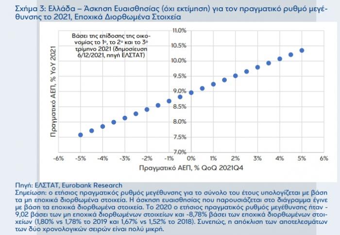 Μετά τη δημοσίευση των θετικών αποτελεσμάτων του 3ου τριμήνου 2021, η περαιτέρω βελτίωση των εκτιμήσεων της κυβέρνησης, της Ευρωπαϊκής Επιτροπής, του Οργανισμού Οικονομικής Συ-νεργασίας και Ανάκαμψης και του Διεθνούς Νομισματικού Ταμείου για τον πραγματικό ρυθμό μεγέθυνσης το 2021 (6,9%, 7,1% και 6,7% και 6,5% αντίστοιχα), θεωρείται πιθανή. Στο Σχήμα 3 παρουσιάζουμε μια αριθμητική άσκηση (όχι εκτίμηση) για τον πραγματικό ρυθμό μεγέθυνσης το 2021 συναρτήσει εναλλακτικών μεγεθών για τον τριμηνιαίο ρυθμό μεταβολής του πραγματικού ΑΕΠ το 4ο τρίμηνο 2021. Επί παραδείγματι, αν το πραγματικό ΑΕΠ στην Ελλάδα το 4ο τρίμηνο 2021 συρρικνωθεί κατά 3,0% σε σχέση με το 3ο τρίμηνο 2021, τότε ο πραγματικός ρυθμός μεγέθυνσης για το σύνολο του έτους 2021 θα είναι 8,1%.