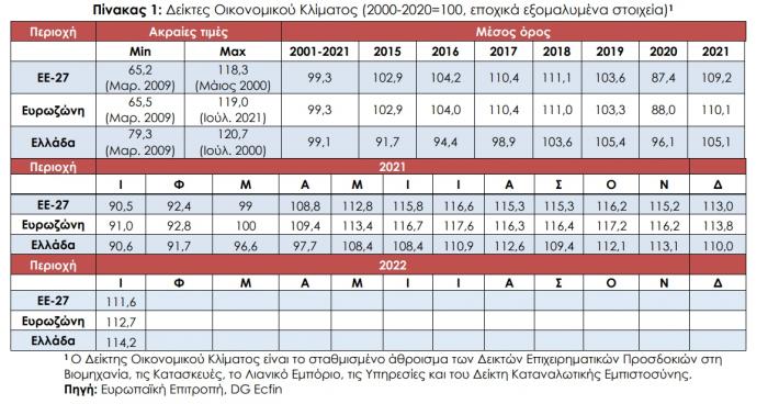 Ειδικότερα, σύμφωνα με την έρευνα του ΙΟΒΕ ο δείκτης οικονομικού κλίματος επανήλθε τον Ιανουάριο σε τροχιά ανόδου και διαμορφώθηκε στις 114,2 μονάδες (από 110,0 τον Δεκέμβριο του 2021), ενώ αντίθετα στην ευρωζώνη και την ΕΕ το οικονομικό κλίμα επιδεινώθηκε ελαφρώς, καθώς οι αντίστοιχοι δείκτες διαμορφώθηκαν στις 112,7 και 111,6 μονάδες αντίστοιχα.