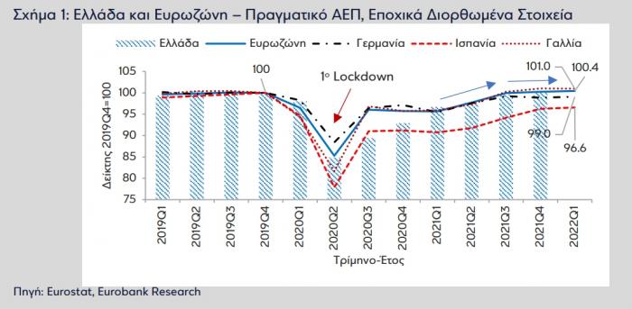 Στις 7 από τις 11 χώρες της ΕΕ-27 για τις οποίες η Eurostat παρέθεσε στοιχεία, η τριμηνιαία μεταβολή του πραγματικού ΑΕΠ κατέβασε ταχύτητα το 1ο τρίμηνο 2022, σε άλλες ήπια (Βέλγιο και Τσεχία) σε άλλες περισσότερο απότομα (Ισπανία και Γαλλία), σε δύο ήταν αρνητική (Ιταλία και Σουηδία) και μόνο σε τρεις ισχυρά θετική (Λετονία, Αυστρία και Πορτογαλία).