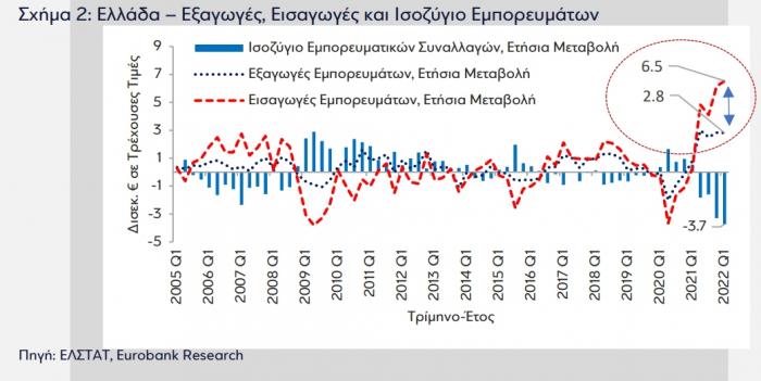 Η ελληνική οικονομία λόγω του υψηλού βαθμού εξάρτησής από τις εισαγωγές ενέργειας επωμίζεται ένα σημαντικό κόστος από την αύξηση των τιμών πετρελαίου και φυσικού αερίου. Η διατήρηση του ίδιου επιπέδου εισαγωγών απαιτεί τη θυσία περισσότερων πόρων. Σύμφωνα με τα στοιχεία εμπορευματικών συναλλαγών της ΕΛΣΤΑΤ, οι εξαγωγές εμπορευμάτων (ζήτηση εγχώριων προϊόντων από την αλλοδαπή) διαμορφώθηκαν στα €11,6 δισεκ. σε τρέχουσες τιμές το 1ο τρίμηνο 2022, ενισχυμένες σε ετήσια βάση κατά 32,0% ή €2,8 δισεκ.