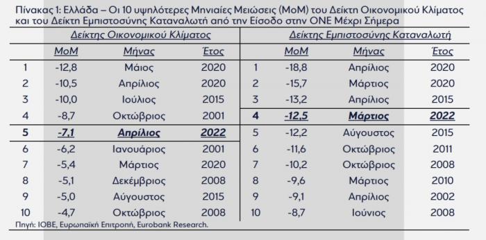 Στην περίπτωση της Ελλάδας, οι παραπάνω εξελίξεις οδήγησαν σε απότομη επιδείνωση του δείκτη καταναλωτικής εμπιστοσύνης τον Μάρτιο 2022 (μηνιαία πτώση κατά 12,5 μονάδες) και του γενικού δείκτη οικονομικού κλίματος τον Απρίλιο 2022 (μηνιαία πτώση κατά 7,1 μονάδες). Στον Πίνακα 1 παρουσιάζουμε τις 10 υψηλότερες μηνιαίες μειώσεις των προαναφερθέντων δεικτών από την είσοδο της Ελλάδας στην Οικονομική και Νομισματική Ένωση (ΟΝΕ) μέχρι σήμερα. Οι παρατηρήσεις του Μαρτίου και του Απριλίου 2022 κατατάσσονται στην πρώτη πεντάδα των αρνητικών μηνιαίων διαταραχών, αμέσως μετά από μήνες που συνδέονται με γεγονότα όπως το 1ο lockdown της πανδημίας του κορωνοϊού COVID-19, η τρομοκρατική επίθεση στους δίδυμους πύργους στη Νέα Υόρκη και η υπογραφή του 3ου Προγράμματος Οικονομικής Προσαρμογής.