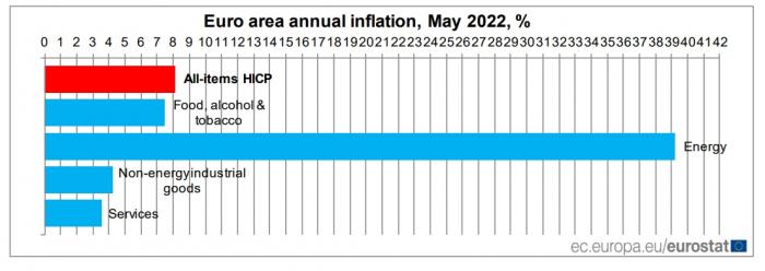 Για έναν ακόμη μήνα ο βασικός παράγοντας ώθησης του δείκτη τιμών καταναλωτή είναι ο ενεργειακός τομέας, με τις τιμές ενέργειας να εκτιμάται ότι έχουν ενισχυθεί κατά 39,2% σε ετήσια βάση, από αύξηση 37,5% που σημείωσαν τον Απρίλιο. Ακολουθούν οι τιμές τροφίμων, αλκοόλ και προϊόντων καπνού με αύξηση 7,5% (από αύξηση 6,3% τον Απρίλιο), ενώ τα μη ενεργειακά βιομηχανικά αγαθά ενισχύθηκαν 4,2% (από 3,8% τον Απρίλιο) και οι τιμές στον τομέα των υπηρεσιών ενισχύθηκα 3,5%.