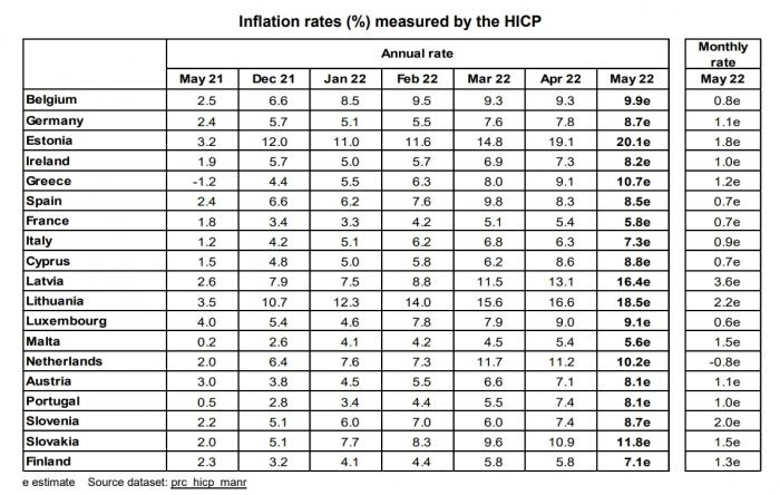 Παράλληλα βάσει των στοιχείων που ανακοίνωσαν οι εθνικές στατιστικές υπηρεσίες στη Γερμανία για τον Μάιο ο εναρμονισμένος δείκτης τιμών καταναλωτή διαμορφώθηκε στο ιστορικό υψηλό του 8,7% έναντι 8% που ανέμεναν οι αναλυτές, ενώ στη Γαλλία για τον ίδιο μήνα έφθασε στο 5,8%.