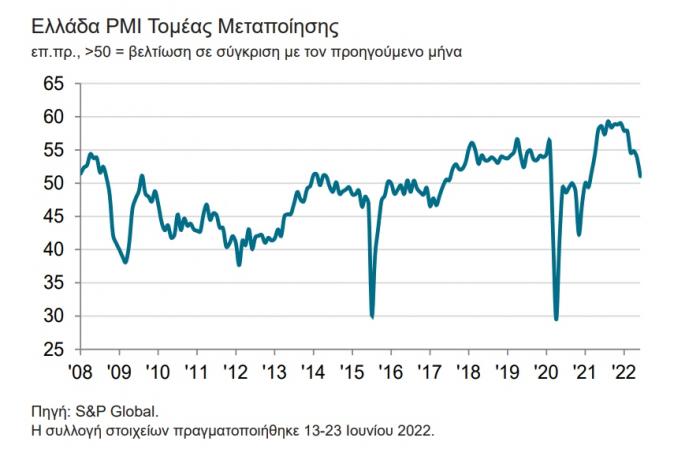 Index – PMI) έκλεισε στις 51.1 μονάδες τον Ιούνιο, τιμή χαμηλότερη από τις 53.8 μονάδες του Μαΐου. Η τελευταία τιμή του κύριου δείκτη υπέδειξε οριακή μόνο βελτίωση της υγείας του ελληνικού μεταποιητικού τομέα, στα μέσα του 2022, και τη βραδύτερη που έχει καταγραφεί στην τρέχουσα περίοδο συνεχούς ανάπτυξης που ξεκίνησε τον Φεβρουάριο του 2021.
