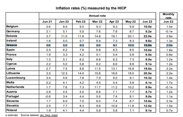Η Ελλάδα συγκαταλέγεται στην «κορυφαία πεντάδα» των πληθωριστικών πιέσεων μεταξύ των κρατών – μελών της Ευρωπαϊκής Ένωσης, σύμφωνα με την πρόβλεψη της Eurostat, η οποία τοποθετεί τον πληθωρισμό για τη ζώνη του ευρώ στο 8,6% από 8,1% που ήταν τον Μάιο και σταθερά σε υψηλό αρκετών δεκαετιών.