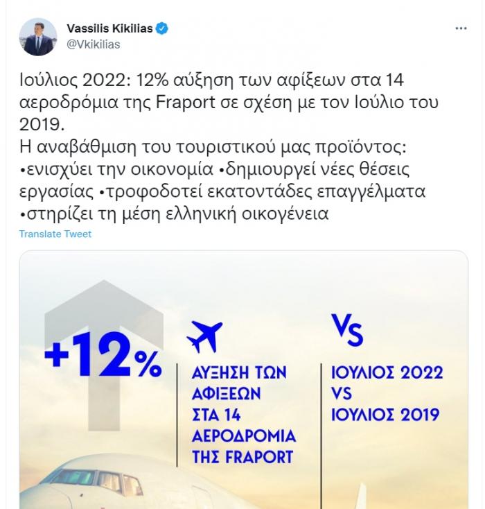 Στα οφέλη που προκύπτουν για την ελληνική οικογένεια από την άνοδο του τουρισμού αναφέρεται σε ανάρτηση του στο Twitter ο υπουργός Τουρισμού Βασίλης Κικίλιας, με αφορμή την αύξηση κατά 12% των αφίξεων εφέτος τον Ιούλιο στα 14 αεροδρόμια της Fraport σε σχέση με τον Ιούλιο του 2019.