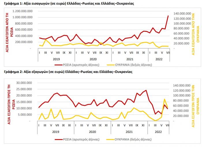 Την περίοδο Ιανουαρίου - Ιουλίου 2022 η αξία των εισαγωγών της Ελλάδας από τη Ρωσία ανήλθε σε 4.510,8 εκατ. ευρώ, σημειώνοντας αύξηση 127,9% σε σχέση με την περίοδο Ιανουαρίου-Ιουλίου 2021 που ήταν 1,9795 δισ. ευρώ. Η αξία των εξαγωγών της Ελλάδας προς τη Ρωσία την περίοδο Ιανουαρίου - Ιουλίου 2022 ανήλθε σε 69,8 εκατ. ευρώ, σημειώνοντας μείωση 32,3% σε σχέση με την περίοδο Ιανουαρίου-Ιουλίου 2021 που ήταν 103,2 εκατ. ευρώ.