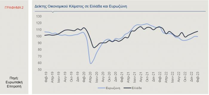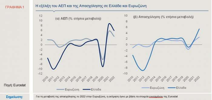 Όπως σημειώνουν οι οικονομολόγοι της τράπεζας, η ελληνική οικονομία κατέγραψε ισχυρές επιδόσεις το 2022, με τον ρυθμό αύξησης του ΑΕΠ να έχει ξεπεράσει σημαντικά τον αντίστοιχο της ευρωζώνης (5,9%, έναντι 3,5%, Γράφημα 1α). Παρά το γεγονός ότι ο ρυθμός οικονομικής μεγέθυνσης αναμένεται να μετριαστεί το τρέχον έτος σε σχέση με πέρυσι, οι εκτιμήσεις μας για το ΑΕΠ του 2023 είναι επί τα βελτίω και οι σημαντικότεροι παράγοντες που προσδιορίζουν αυτή την εξέλιξη είναι οι ακόλουθοι: