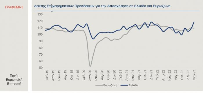 - Δεύτερον, ο Δείκτης Οικονομικού Κλίματος (Economic Sentiment Index, ESI) υπερβαίνει από τον Μάιο του 2022 τον αντίστοιχο δείκτη της Ευρωζώνης, ακολουθώντας έντονα ανοδική τροχιά τους τελευταίους τέσσερις μήνες (Γράφημα 2). Ο δείκτης ESI, ο οποίος αποτελεί πρόδρομο δείκτη της οικονομικής δραστηριότητας, ανήλθε τον Φεβρουάριο σε 107,5 μονάδες, ενώ τον ίδιο μήνα του 2022, δηλαδή πριν το ξέσπασμα του πολέμου στην Ουκρανία, είχε σημειώσει τη δεύτερη υψηλότερη επίδοση των τελευταίων 20 ετών (Φεβρουάριος 2022: 113,9 μονάδες). Στη συνέχεια, η αβεβαιότητα εντάθηκε εξαιτίας του πολέμου και της ενεργειακής κρίσης ως απόρροια αυτού, με αποτέλεσμα την επιδείνωση του δείκτη. Ωστόσο, οι συντονισμένες ενέργειες σε ευρωπαϊκό επίπεδο για την εξασφάλιση της ενεργειακής επάρκειας τον φετινό χειμώνα, σε συνδυασμό με τις ήπιες καιρικές συνθήκες και τα μέτρα στήριξης που υιοθετήθηκαν από την κυβέρνηση για την αντιμετώπιση των αρνητικών επιπτώσεων του αυξημένου ενεργειακού κόστους, οδήγησαν στην ανάκαμψη του δείκτη ESI. Η άνοδος του δείκτη οικονομικού κλίματος, κατά τους τελευταίους μήνες, οφείλεται κυρίως στη βελτίωση των επιχειρηματικών προσδοκιών στις κατασκευές και ακολουθούν το λιανικό εμπόριο και η βιομηχανία, ενώ σημαντική βελτίωση παρουσιάζει στο διάστημα αυτό και η καταναλωτική εμπιστοσύνη. Τέλος, σε ό,τι αφορά στις επιχειρηματικές προσδοκίες για την απασχόληση, είναι ιδιαίτερα θετικές τους τελευταίους μήνες, όπως αποτυπώνονται στην πορεία του σχετικού δείκτη της Ευρωπαϊκής Επιτροπής (Γράφημα 3), ο οποίος σημειώνει εντυπωσιακή άνοδο από τον Νοέμβριο του 2022. Συγκεκριμένα, τον Φεβρουάριο, αυξήθηκε κατά 10,2 μονάδες σε μηνιαία βάση, ενώ σε σύγκριση με τον Οκτώβριο του 2022 έχει αυξηθεί συνολικά κατά 19,2 μονάδες, με τις προσδοκίες για την απασχόληση να είναι βελτιωμένες σε όλους τους τομείς οικονομικής δραστηριότητας.