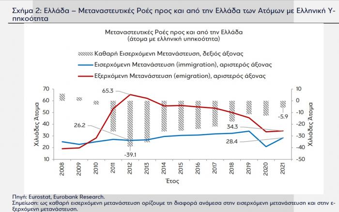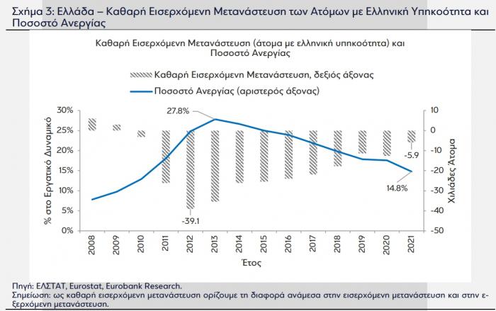 Όπως αναφέρει η Eurobank, η φυγή νέων προς το εξωτερικό προκειμένου να βρουν μία καλύτερη θέση εργασίας έχει υποχωρήσει σημαντικά αλλά χρειάζονται ακόμη προσπάθειες ώστε το φαινόμενο αυτό να σταματήσει και αν όχι το σύνολό τους, τότε το μεγαλύτερο μέρος όσων εξ αυτών που μετανάστευσαν αναγκαστικά να επιστρέψουν στην Ελλάδα.