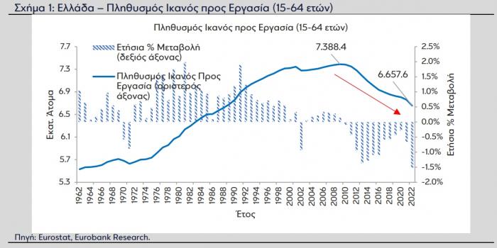 Η μείωση του πληθυσμού ικανού προς εργασία τα τελευταία 13 χρόνια, πέραν άλλων σημαντικών παραγόντων όπως ο χαμηλός ρυθμός γεννητικότητας, συνδέεται και με τη μετανάστευση Ελλήνων και Ελληνίδων στο εξωτερικό κατά τη διάρκεια της κρίσης χρέους (μεγάλη ύφεση και μεγάλη στασιμότητα), μια εξέλιξη που είναι ευρέως γνωστή στον δημόσιο διάλογο ως εκροή ανθρώπινου κεφαλαίου (brain drain).