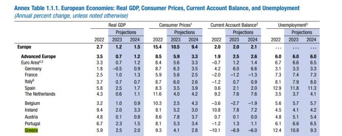 Την ίδια ώρα αναμένει ότι η ευρωζώνη θα τρέξει το 2023 με ρυθμό 0,7%, ενώ θα ανοίξει ελαφρώς τον βηματισμό της με ανάπτυξη 1,2% το 2024, με ιδιαίτερα δυσάρεστη πρόβλεψη για τη γερμανική οικονομία καθώς εκτιμά ότι θα συρρικνωθεί το 2023 κατά 0,5%.