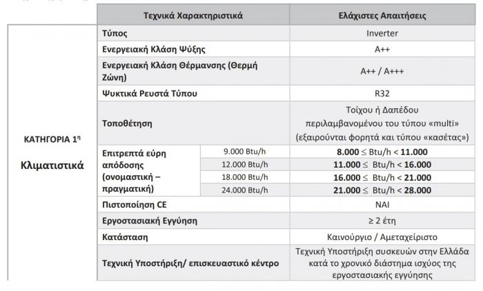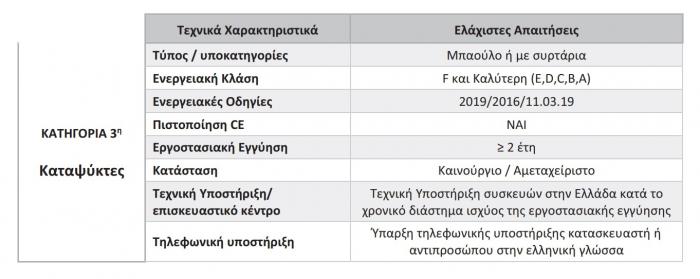 Το Πρόγραμμα επιχορηγεί την αγορά των ακόλουθων κατηγοριών ηλεκτρικών συσκευών, με τα αντίστοιχα ελάχιστα χαρακτηριστικά: