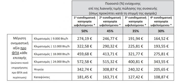 - Παράδειγμα #2: ωφελούμενος της 2ης εισοδηματικής κατηγορίας λαμβάνει επιταγή για αγορά κλιματιστικού. Κατά τη στιγμή της αγοράς επιλέγει μοντέλο 12.000 Btu/h με τιμή αγοράς 868Ε € (700€ καθαρή αξία+168€ ΦΠΑ). Ο ΦΠΑ που εφαρμόζεται στη συγκεκριμένη περίπτωση είναι 24%. - Εφαρμόζοντας το ποσοστό ενίσχυσης του συγκεκριμένου ωφελούμενου επί της καθαρής αξίας προκύπτει 700,00€ x 45% = 315,00€. - Το ποσό αυτό είναι υψηλότερο από τη μέγιστη ονομαστική αξία προ ΦΠΑ της επιταγής για αυτή την κατηγορία συσκευής και εισοδηματική κατηγορία ωφελούμενου (315,00 > 290,32€). Επομένως η επιδότηση ΰα εφαρμοστεί στη μεγίστη ονομαστική αξία και στο ΦΠΑ που αναλογεί στην αξία αυτή, ήτοι - 290,32€+(24%χ290,32€) = 290,32€+69,68€ =360,00€.