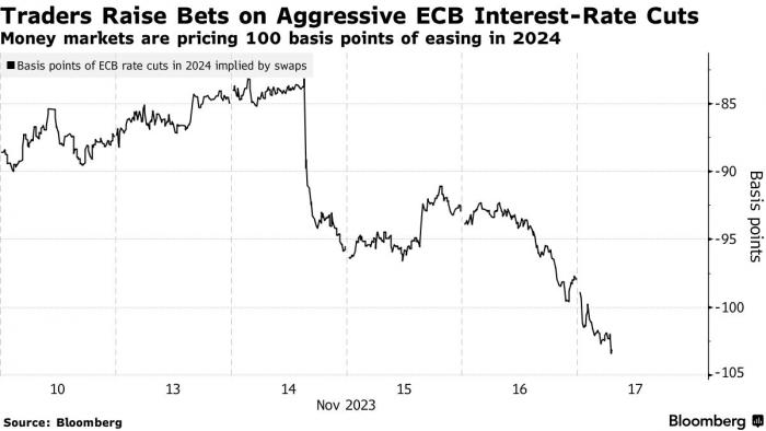 Για πρώτη φορά οι αγορές χρήματος εκτιμούν ότι η ΕΚΤ θα προχωρήσει σε μείωση κατά 1% το 2024, ενώ πριν από δύο μήνες η αντίστοιχη εκτίμηση έκανε λόγω για 0,75%. Ανάλογα είναι τα στοιχήματα για μειώσεις τόσο από πλευράς της Τράπεζας της Αγγλίας, ενώ αλλά και για τη Fed, με τους traders να τονίζουν ότι η πορεία της οικονομίας αλλά και του πληθωρισμού δίνει την ευχέρεια στις κεντρικές τράπεζες να καταστούν πιο χαλαρές κατά τη διάρκεια του επόμενου έτους.