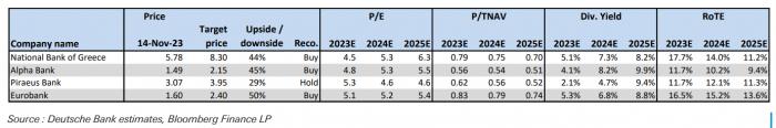 Η αναβάθμιση έρχεται στον απόηχο τόσο των ισχυρών μεγεθών γ' τριμήνου/9μηνου των τεσσάρων συστημικών τραπεζών όσο και στην επιτυχημένη αποεπένδυση του TXΣ, με τη γερμανική τράπεζα να δίνει τις εξής τιμές - στόχου: