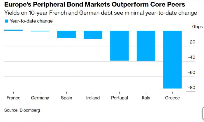 Η JPMorgan Asset Management τοποθετείται σε ισπανικό χρέος μαζί με τη Neuberger Berman, όπου οι διαχειριστές κεφαλαίων προτιμούν επίσης την Πορτογαλία και την Ελλάδα. Η Goldman Sachs Group και η Societe Generale προβλέπουν ότι τμήματα της ευρωπαϊκής περιφέρειας θα συνεχίσουν να υπεραποδίδουν το επόμενο έτος. Η αλλαγή είναι τέτοια που η Commerzbank υποστηρίζει ότι θα πρέπει να ξεχαστούν οι ξεπερασμένοι παλιοί διαχωρισμοί αλλά και υποτιμητικά «παρατσούκλια» τύπου PIGS. Η θετική άποψη συνοδεύεται από αναβαθμίσεις αξιολογήσεων. Τις τελευταίες εβδομάδες, η Πορτογαλία αναβαθμίστηκε από τη Moody's Investors Service και η Ελλάδα αναβαθμίστηκε σε επενδυτική βαθμίδα από την S&P Global Ratings, ενώ εκτιμάται ότι θα υπάρξει και νέα αναβάθμιση από τον οίκο Fitch.