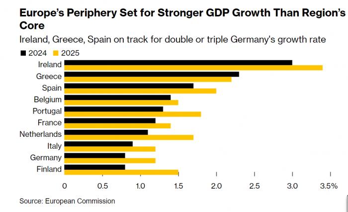 Από τις τρεις χώρες θα προέλθουν περίπου 50 δισ. ευρώ το 2024 σε σύγκριση με σχεδόν τετραπλάσια ποσά από τη Γαλλία και τη Γερμανία, σύμφωνα με την Goldman Sachs. Η Ισπανία πούλησε έντοκα γραμμάτια τριών και εννέα μηνών αυτό το μήνα με χαμηλότερες αποδόσεις από αυτές που πλήρωναν τα αντίστοιχα γερμανικά έντοκα γραμμάτια τη στιγμή της δημοπρασίας.