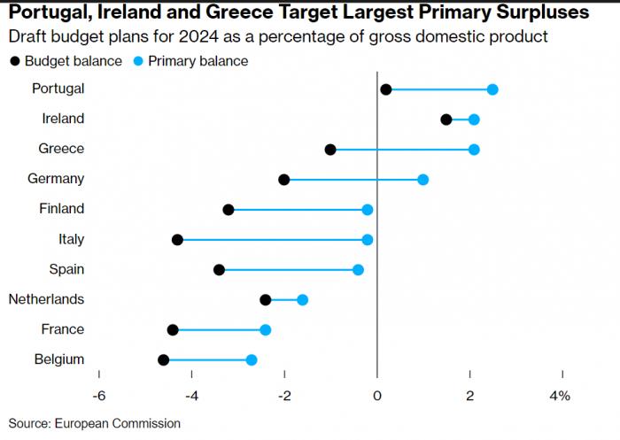 Αν και τα όρια δαπανών παραμένουν αμφιλεγόμενα, η προσπάθεια αυτή έφερε χώρες όπως η Πορτογαλία, η Ιρλανδία και η Ελλάδα σε τροχιά για πρωτογενή πλεονάσματα το επόμενο έτος - ένα θετικό ισοζύγιο εξαιρουμένων των δαπανών για τόκους - ενώ η Γαλλία και το Βέλγιο οδεύουν προς τα μεγαλύτερα ελλείμματα.