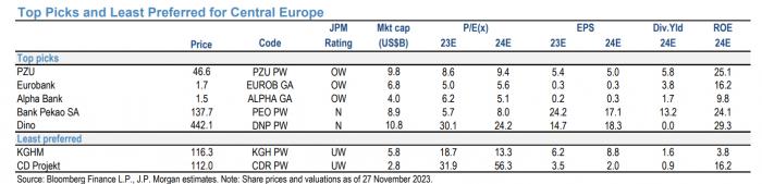 Η σύσταση «overweight» δίνεται στην εγχώρια αγορά καθώς υπάρχουν χαμηλές αποτιμήσεις αλλά και τη σταθερή αναβάθμιση των εκτιμήσεων για τα κέρδη ανά μετοχή στις τέσσερις συστημικές τράπεζες. Η αμερικανική τράπεζα προβλέπει ότι ο δείκτης θα καταγράψει κέρδη 9% έως τα τέλη του 2024 και αυτό χάρη σε αγορές όπως η ελληνική (μαζί με αυτές της Σαουδικής Αραβίας και των Ηνωμένων Αραβικών Εμιράτων).