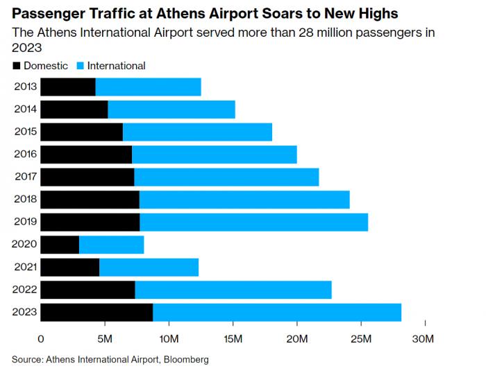 Το σημαντικότερο ΙΡΟ της Ελλάδας από το 2000 θα βοηθήσει το μεγαλύτερο αεροδρόμιο της χώρας να επεκταθεί, καθώς οι αφίξεις τουριστών σημειώνουν νέα ρεκόρ. Το αεροδρόμιο της Αθήνας, το οποίο συνδέει την Ελλάδα με 155 πόλεις παγκοσμίως, διακίνησε περισσότερους από 28 εκατομμύρια επιβάτες το 2023 - αύξηση 24% σε σχέση με το προηγούμενο έτος. Περίπου 19 εκατομμύρια από αυτούς προέρχονταν από το εξωτερικό, γεγονός που δείχνει τον κεντρικό του ρόλο στον κρίσιμο τουριστικό τομέα της Ελλάδας.