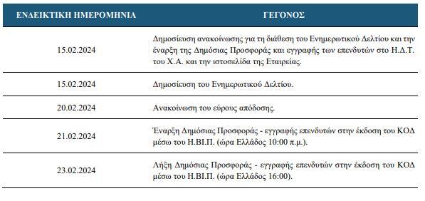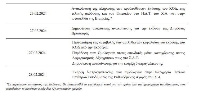 Kατωτέρω, παρατίθεται το αναμενόμενο χρονοδιάγραμμα της ολοκλήρωσης της Δημόσιας Προσφοράς της έκδοσης του ΚΟΔ και της εισαγωγής προς διαπραγμάτευση των Ομολογιών στην Κατηγορία Τίτλων Σταθερού Εισοδήματος της Ρυθμιζόμενης Αγοράς του Χ.Α., το οποίο έχει ως εξής: