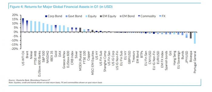 - Δολάριο: Με τη Fed να μην μειώνει τα επιτόκια το α' τρίμηνο, σε αντίθεση με τις εκτιμήσεις της αγοράς στην αρχή του τριμήνου, αυτό βοήθησε στη στήριξη του δολαρίου. Ενισχύθηκε έναντι κάθε άλλου νομίσματος της G10 και ο δείκτης δολαρίου σημείωσε άνοδο +3,1% το α' τρίμηνο.
