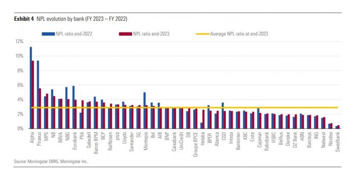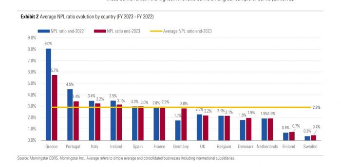 Σημειώνεται ότι ο οίκος εξετάζει την πορεία μείωσης των NPL σε 44 τράπεζες της Ευρώπης, συμπεριλαμβανομένων αυτών στην Αυστρία, τη Γαλλία, τη Γερμανία, την Ιταλία, τις Κάτω Χώρες, την Ισπανία, τη Σουηδία, τη Νορβηγία, την Πορτογαλία, τη Δανία, τη Φινλανδία, το Βέλγιο, την Ιρλανδία και το Ηνωμένο Βασίλειο και την Ελλάδα. Ο μέσος δείκτης μη εξυπηρετούμενων δανείων για το δείγμα των ευρωπαϊκών τραπεζών ήταν 2,9% στο τέλος του 2023, ελαφρώς βελτιωμένος από το 3,1% στο τέλος του 2022.