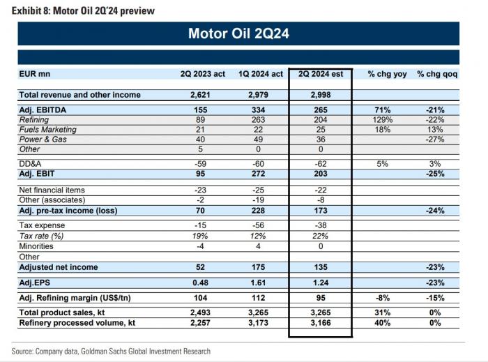 Στην έκθεση τονίζεται ότι το προσαρμοσμένο περιθώριο διύλισης για το Motor Oil θα μειωθεί κατά περίπου 15% στο β’ τρίμηνο του 2024 και σε τριμηνιαία βάση. Παράλληλα οι όγκοι διύλισης και πωλήσεων θα παραμείνουν ισχυροί (σύμφωνα με τα σχόλια της εταιρείας, τα ποσοστά χρησιμοποίησης συνεχίζουν να κινούνται πάνω από την ονομαστική δυναμικότητα των 2.000 kbpd το 2ο τρίμηνο). Συνολικά, τα BITDA της Motor Oil για το 2ο τρίμηνο θα φθάσουν στα 265 εκατ. ευρώ.