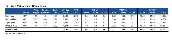 Παράλληλα αναφέρει ότι οι τράπεζες, κατά μέσο όρο, διαπραγματεύονται με P/E της τάξης του 5,0x με βάση τις προβλέψεις για το 2026, μια έκπτωση 20-30% σε σχέση με τις ευρωπαϊκές. Σημειώνεται ότι τέτοιες εκπτώσεις δεν δικαιολογούνται εν όψει της καλύτερης μακροοικονομικής εικόνας (αύξηση ΑΕΠ >2,0% ετησίως έως το 2026), υψηλότερης αύξησης δανείων (3ετές CAGR 7%) και ανώτερων ROTE (βιώσιμα σε 13-14%).