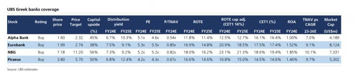 Όπως αναφέρει «η ΕΤΕ είναι η κορυφαία επιλογή μας για την ποιοτική έκθεση στην ιστορία ανάκαμψης της Ελλάδας, την υψηλή κερδοφορία, την ισχυρή κεφαλαιακή θέση, την καλή πιστωτική ποιότητα, την προαιρετικότητα της επιστροφής του πλεονάζοντος κεφαλαίου πάνω από τα σχέδια διανομής. Η Πειραιώς είναι η κορυφαία επιλογή μας για δυνατότητα επαναξιολόγησης, αξιοσημείωτη ιστορία ανάκαμψης καθώς τα NPEs της έχουν ομαλοποιηθεί, σταθερή κερδοφορία, αλλά ασθενέστερη κεφαλαιακή θέση. Η Eurobank προσφέρει ανοδική προαιρετικότητα από την εξαγορά της Ελληνικής Τράπεζας, ιστορία περιφερειακής διαφοροποίησης σε Κύπρο και Βουλγαρία, προσφέροντας υψηλή κερδοφορία και κεφαλαιακή ευελιξία, αρνητικό το υψηλότερο κόστος χρηματοδότησης. Η Alpha Bank είναι ένας κορυφαίος εταιρικός δανειστής με κεφάλαια ενισχυμένα από τη συγχώνευση με την UniCredit στη Ρουμανία, αλλά έχει χαμηλότερη κερδοφορία, ιδιαίτερα χαμηλότερο επιτοκιακό περιθώριο (NIM), αλλά και υψηλή δυνατότητα διανομής σε σχέση με την κεφαλαιοποίηση της αγοράς».