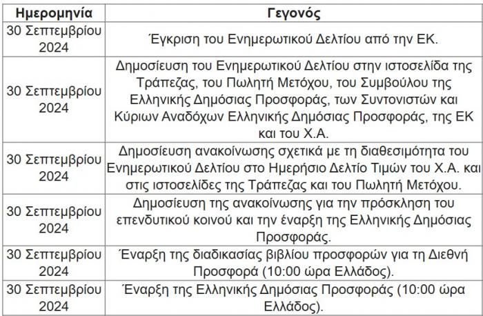 Στις 28 Σεπτεμβρίου 2024, το διοικητικό συμβούλιο του Ταμείου Χρηματοπιστωτικής Σταθερότητας («ΤΧΣ» ή «Πωλητής Μέτοχος») ενέκρινε, μεταξύ άλλων, τη διάθεση συμμετοχής 10% στο μετοχικό κεφάλαιο της «Εθνική Τράπεζα της Ελλάδος ΑΕ» (εφεξής «ΕΤΕ» ή «Τράπεζα»), που αντιστοιχεί σε 91.471.515 υφιστάμενες κοινές, ονομαστικές, άυλες, με δικαίωμα ψήφου μετοχές, εισηγμένες στη ρυθμιζόμενη αγορά του Χρηματιστηρίου Αθηνών (“Χ.Α.”), ονομαστικής αξίας εκάστης €1,00 στο μετοχικό κεφάλαιο της ΕΤΕ (οι «Προσφερόμενες Μετοχές»), σε τιμή διάθεσης (η «Τιμή Προσφοράς») που κυμαίνεται μεταξύ €7,30 και €7,95 ανά Προσφερόμενη Μετοχή. Η Τράπεζα δεν προσφέρει Προσφερόμενες Μετοχές και δεν θα λάβει έσοδα από την πώληση των Προσφερόμενων Μετοχών, τα καθαρά έσοδα από την πώληση των οποίων θα εισπραχθούν από τον Πωλητή Μέτοχο.