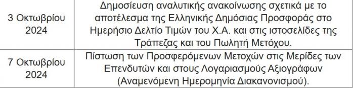 Η τελική κατανομή των Προσφερόμενων Μετοχών μεταξύ της Ελληνικής Δημόσιας Προσφοράς και της Διεθνούς Προσφοράς θα καθοριστεί μετά τη λήξη της περιόδου του βιβλίου προσφορών για τη Διεθνή Προσφορά και την Ελληνική Δημόσια Προσφορά κατά ή περί τις 2 Οκτωβρίου 2024 από τον Πωλητή Μέτοχο και οι επενδυτές θα ενημερωθούν μέσω της δημοσίευσης της σχετικής ανακοίνωσης προς τους επενδυτές στο Ημερήσιο Δελτίο Τιμών του Χ.Α. και στις ιστοσελίδες της Τράπεζας και του Πωλητή Μετόχου.
