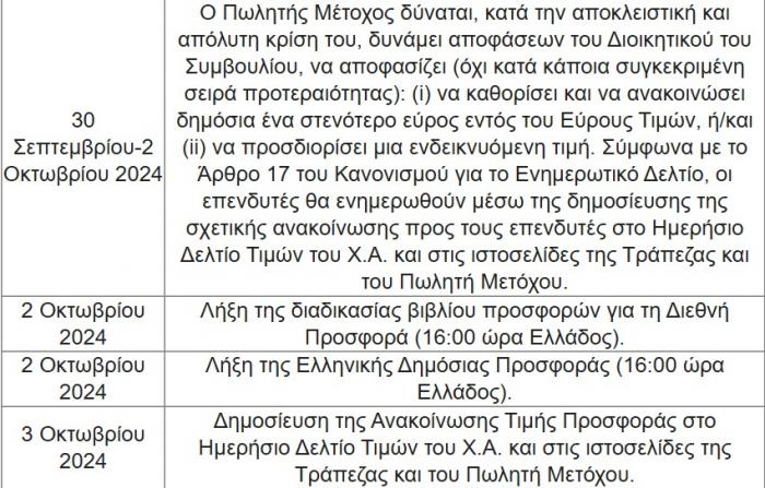 Επιπλέον, σε οποιαδήποτε στιγμή κατά την διαδικασία βιβλίου προσφορών για την Διεθνή Προσφορά, ο Πωλητής Μέτοχος δύναται, κατά την αποκλειστική και απόλυτη κρίση του, δυνάμει αποφάσεων του Διοικητικού του Συμβουλίου να αποφασίζει (όχι κατά κάποια συγκεκριμένη σειρά προτεραιότητας) να καθορίσει και να ανακοινώσει δημόσια ένα στενότερο εύρος εντός του Εύρους Τιμών, ή/και να προσδιορίσει μια ενδεικνυόμενη τιμή. Σύμφωνα με το Άρθρο 17 του Κανονισμού για το Ενημερωτικό Δελτίο, οι επενδυτές θα ενημερωθούν μέσω της δημοσίευσης της σχετικής ανακοίνωσης προς τους επενδυτές στο Ημερήσιο Δελτίο Τιμών του Χ.Α. και στις ιστοσελίδες της Τράπεζας και του Πωλητή Μετόχου.