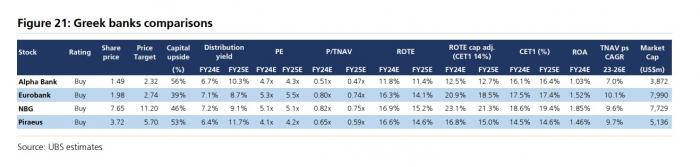 Αναφορικά με τις τραπεζικές μετοχές οι αναλυτές της UBS σημειώνουν ότι διατηρεί τη σύσταση «αγορά» και για τους τέσσερις συστημικούς ομίλους, από τον Ιούλιο όταν ξεκίνησε την κάλυψή τους και τονίζουν ότι υπάρχουν τρεις λόγοι γι’ αυτήν τη στάση: