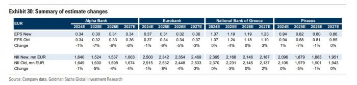 Η αναθεώρηση αυτή μεταφράζεται σε 0%/-5%/-2%/-1% μέση αναθεώρηση των εσόδων από τόκους (ΝΙΙ) για τις ελληνικές τράπεζες το 2024/2025/2026/2027 και 0%/-6%/-3%/-1% αναθεώρηση των κερδών ανά μετοχή το 2024-2027. Ως αποτέλεσμα της αναθεώρησης των κερδών ανά μετοχή σε αυτά τα έτη, οι τιμές-στόχοι μας για τις ελληνικές τράπεζες μειώνονται κατά 6% κατά μέσο όρο.