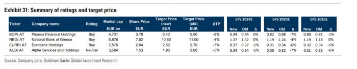 Σε επικαιροποίηση των εκτιμήσεών της για την πορεία των τεσσάρων συστημικών τραπεζών, προχωρά η Goldman Sachs, βασισμένη στα τελευταία στοιχεία που έδωσε στη δημοσιότητα η Τράπεζα της Ελλάδος, αναφορικά τόσο με τις μακροοικονομικές της εκτιμήσεις όσο και τις τάσεις που αναμένεται να επικρατήσουν στον κλάδο.