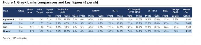 Όσον αφορά τα κεφάλαια, η UBS σημειώνει ότι οι δείκτες CET1 συνεχίζουν να αυξάνονται και όλες οι τράπεζες ανακοίνωσαν την επιτάχυνση της απόσβεσης των DTC με την πρόσθετη χρέωση να αντιστοιχεί στο 29% του ποσού πληρωμής. Οι τράπεζες παραμένουν συντηρητικές στην καθοδήγηση για τα μερίσματα, αλλά ανέφεραν ότι για τη χρήση 2024 είναι πιθανό να είναι υψηλότερα (έως και 50% για την Eurobank και την Εθνική, αυξημένα στο 35% για την Πειραιώς και στην Alpha πιθανόν να αυξηθούν από 35%).