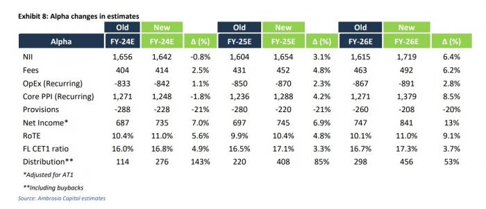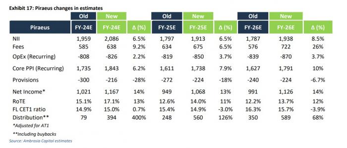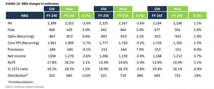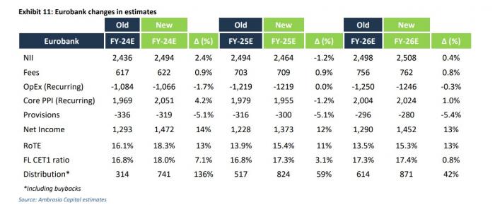 Προβλέπεται ότι τα μεγέθη RoTE θα παραμείνουν ισχυρά με σταθερή απόδοση του, ισχυρή αύξηση των εσόδων από προμήθειες, συνεχή ομαλοποίηση του κόστους κινδύνου χαμηλότερα και αύξηση των διανομών προς τους μετόχους. Η έναρξη των επαναγορών θα πρέπει επίσης να περιορίσει τις πτωτικές πιέσεις στην αύξηση των κερδών ανά μετοχή τόσο το 2025 όσο και το 2026.