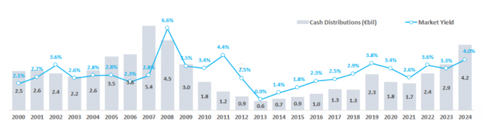 Άκρως αποδοτική χρονιά ήταν για τους μετόχους το 2024 αφού οι χρηματικές διανομές (μερίσματα, προμερίσματα, επιστροφές κεφαλαίου κ.α.) ξεπέρασαν τα 4,2 δισ. ευρώ. Οι απολαβές των μετόχων προέρχονται από τα κέρδη του 2023 αλλά και από προμερίσματα εντός του 2024 λόγω της καλής πορείας των εισηγμένων και το τρέχον έτος.