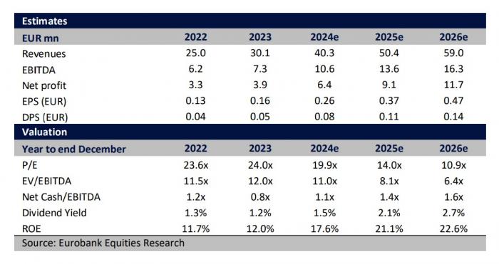 Εκτιμά ότι οι πωλήσεις για το 2024 θα φθάσουν στα 40,3 εκατ. ευρώ, καθώς ξεκινούν να ωριμάζουν και τα έργα ψηφιοποίηση του Δημοσίου στα οποία συμμετέχει η εταιρεία, δηλαδή θα εμφανίζουν άνοδο 34% σε ετήσια βάση, ενώ τα EBITDA αναμένεται ότι θα ενισχυθούν 45% στα 10,6 εκατ. ευρώ, με το περιθώριο EBITDA να φθάνει στο 26,4%.