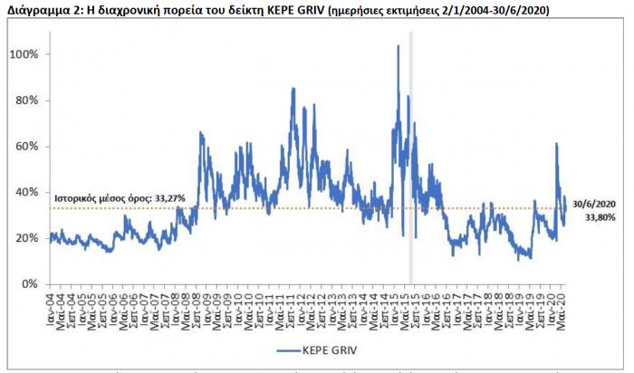 Αυτή ακριβώς η αβεβαιότητα αποτυπώνεται και τον δείκτη τεκμαρτής μεταβλητότητας, τον οποίο συντάσει το ΚΕΠΕ, KEPE GRIV ή «Δείκτη Φόβου», ο οποίος διαμορφώθηκε τον Ιούνιο του 2020 στο 33,8% από 29,56% που ήταν τον προηγούμενο μήνα. Σημειώνεται ότι ο εν λόγω δείκτης «καταγράφει» την αναμενόμενη βραχυπρόθεσμη πορεία της ελληνικής αγοράς και υπολογίζεται στη βάση των τιμών των δικαιωμάτων προαίρεσης του δείκτη FTSE/X.A. Large Cap.