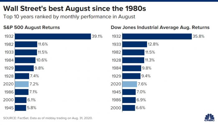 Τα κέρδη για τον Dow Jones από την αρχή του μήνα έφθασαν στο 7,8%, με αποτέλεσμα να είναι ο καλύτερος Αύγουστος από το 1984, ενώ ο S&P 500 είχε μηνιαία άνοδο 7%, δηλαδή τον καλύτερο Αύγουστο από το 1986.